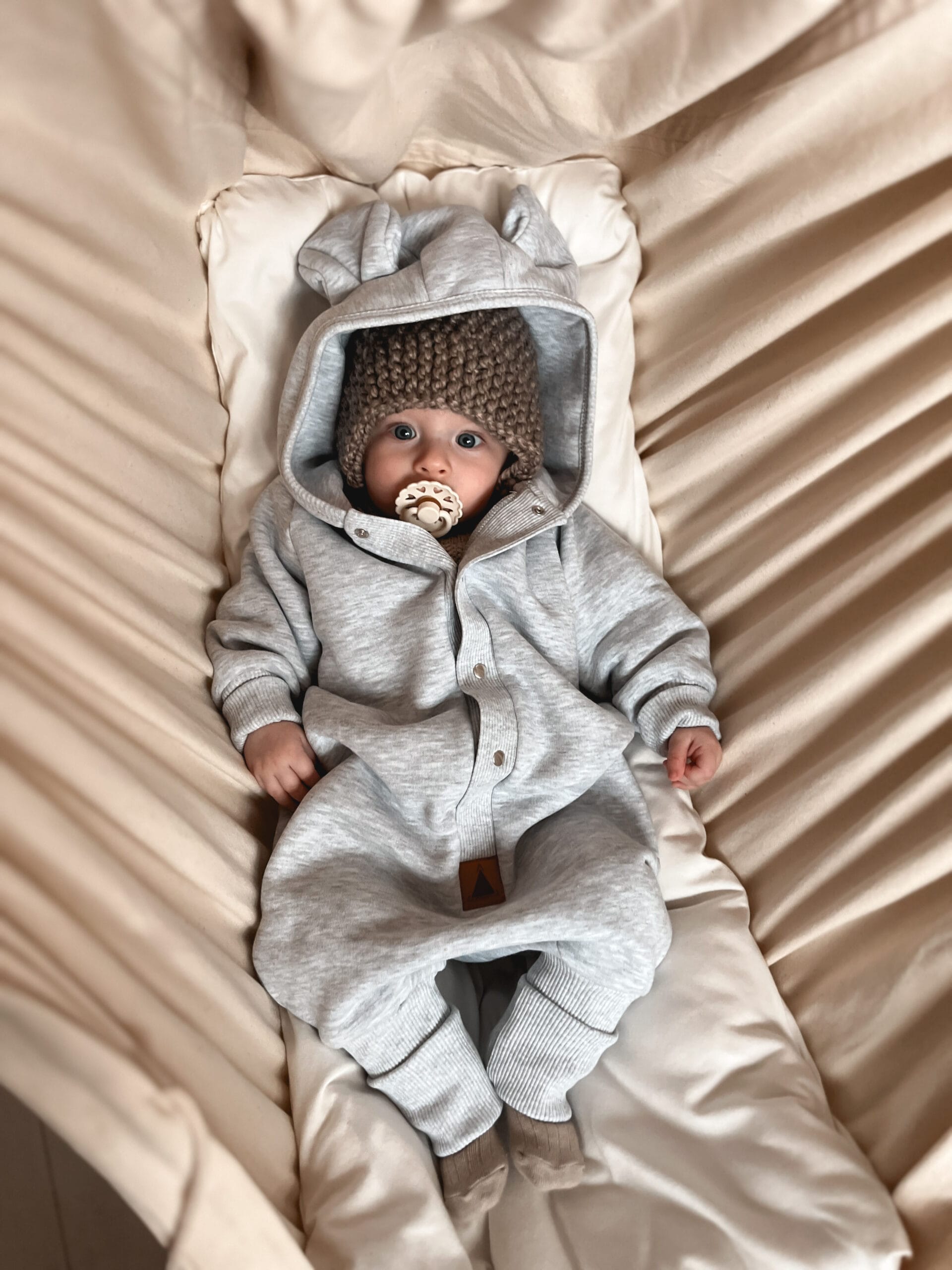 Mukava haalari vauvoille ja lapsille, täydellinen viileämpiin päiviin. Valmistettu pehmeästä, hengittävästä puuvillasta, jossa on ripaus joustavuutta mukavuuden takaamiseksi, ja siinä on suloinen huppu, jossa on söpöt, pyöristetyt korvat, jotka luovat leikkisän, karhunomaisen ilmeen. Haalarissa on taitettavat hihansuut ja lahkeensuut, jotka mahdollistavat kasvunvaran pikkuisen kasvaessa. Suunniteltu hellävaraisesta, ihoa suojaavasta kankaasta, se tarjoaa lämpöä ilman ylikuumenemista. Ihanteellinen sekä leikki- että päiväunille, tässä viehättävässä vaatekappaleessa yhdistyvät tyyli ja käytännöllisyys, joten se on jokaisen lapsen vaatekaappi.